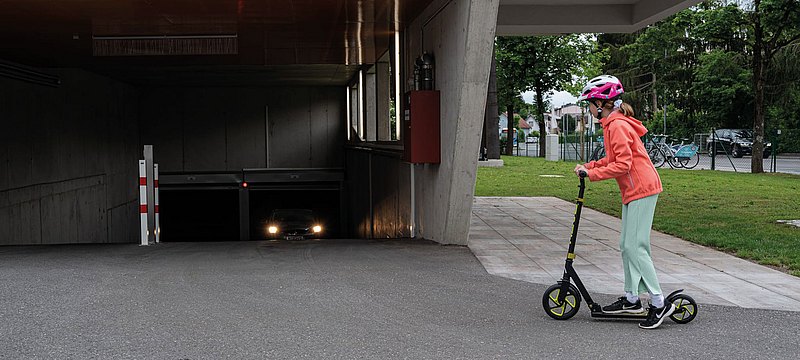 Die Fahrbahn darf niemals unmittelbar vor einem herannahenden Fahrzeug und für den:die Lenker:in überraschend überquert werden. Kinder unterschätzen oft die Geschwindigkeit, die sie mit einem Tretroller erzielen können. Deshalb ist es wichtig, vor jeder Fahrbahnüberquerung mit dem Roller anzuhalten, das heißt, langsam zur Überquerungsstelle hinrollen und rechtzeitig beim Gehsteigrand stoppen. Nur so kann sich das Kind gut auf das weitere Verkehrsgeschehen und das richtige Verhalten bei der Überquerung konzentrieren. Aus Sicherheitsgründen empfehlen wir, den Roller bei der Überquerung zu schieben.
