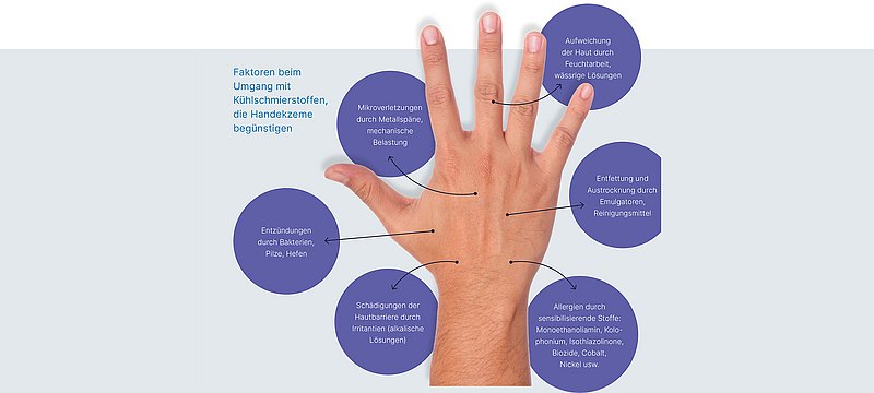 Aufgrund ihrer Inhaltsstoffe sowie der entstehenden Stoffe können von KSS Gesundheitsgefahren ausgehen. Der regelmäßige Kontakt der Haut mit wässrigen Kühlschmierstoffen führt zur Aufweichung der Hornschicht, dem Verlust natürlicher Fette und somit zu einer geschwächten Hautbarriere. Symptome wie Juckreiz, Rötungen, Schuppenbildung, Risse oder Bläschen können auftreten. Die gestörte Hautbarriere erhöht das Risiko für Infektionen und allergische Reaktionen. Allergien bleiben lebenslang bestehen und können bereits durch geringste Mengen des Allergens ausgelöst werden.
