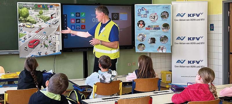 AUVA und KFV haben den Workshop „Sicheres Rollern“ für Volksschulen in Wien, Niederösterreich und dem Burgenland ins Leben gerufen. Hier lernen die Kinder nicht nur, wo sie mit dem Tretroller im Straßenverkehr unterwegs sein dürfen, welche Regeln gelten und wie sie sie sich richtig verhalten – auch die häufigsten Unfallursachen und wie man sie vermeidet stehen auf dem Programm. Natürlich darf das Thema Schutzausrüstung nicht fehlen, wie der passende Fahrradhelm oder Reflektoren.