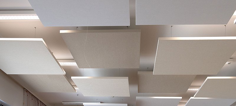 Wenn in großen Arbeitsräumen viele laute Tätigkeiten parallel ausgeführt werden, können schallabsorbierende Platten hilfreich sein. Für den Einzelnen ist der Lärm lokalisierter und begrenzter, und es entsteht das Gefühl, dem Lärm der anderen weniger stark ausgesetzt zu sein. Maßnahmen direkt an den Lärmquellen sind in so einem Fall trotzdem wirksamer und sollten das Ziel sein.